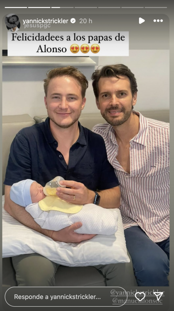 Este 9 de mayo, Yannick Strickler, hijo de René Strickler, y su esposo, Manuel Alonso Cárdenas, dieron la bienvenida al mundo a su primogénito, Alonso, compartiendo la noticia a través de Instagram.