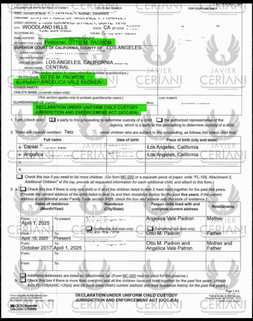 Los documentos de la Corte Superior de Los Ángeles, donde se tramita el divorcio, revelan que Otto Padrón solicitó la custodia legal compartida, así como la emisión de órdenes previas a cualquier cambio de residencia que pueda afectar a los menores.