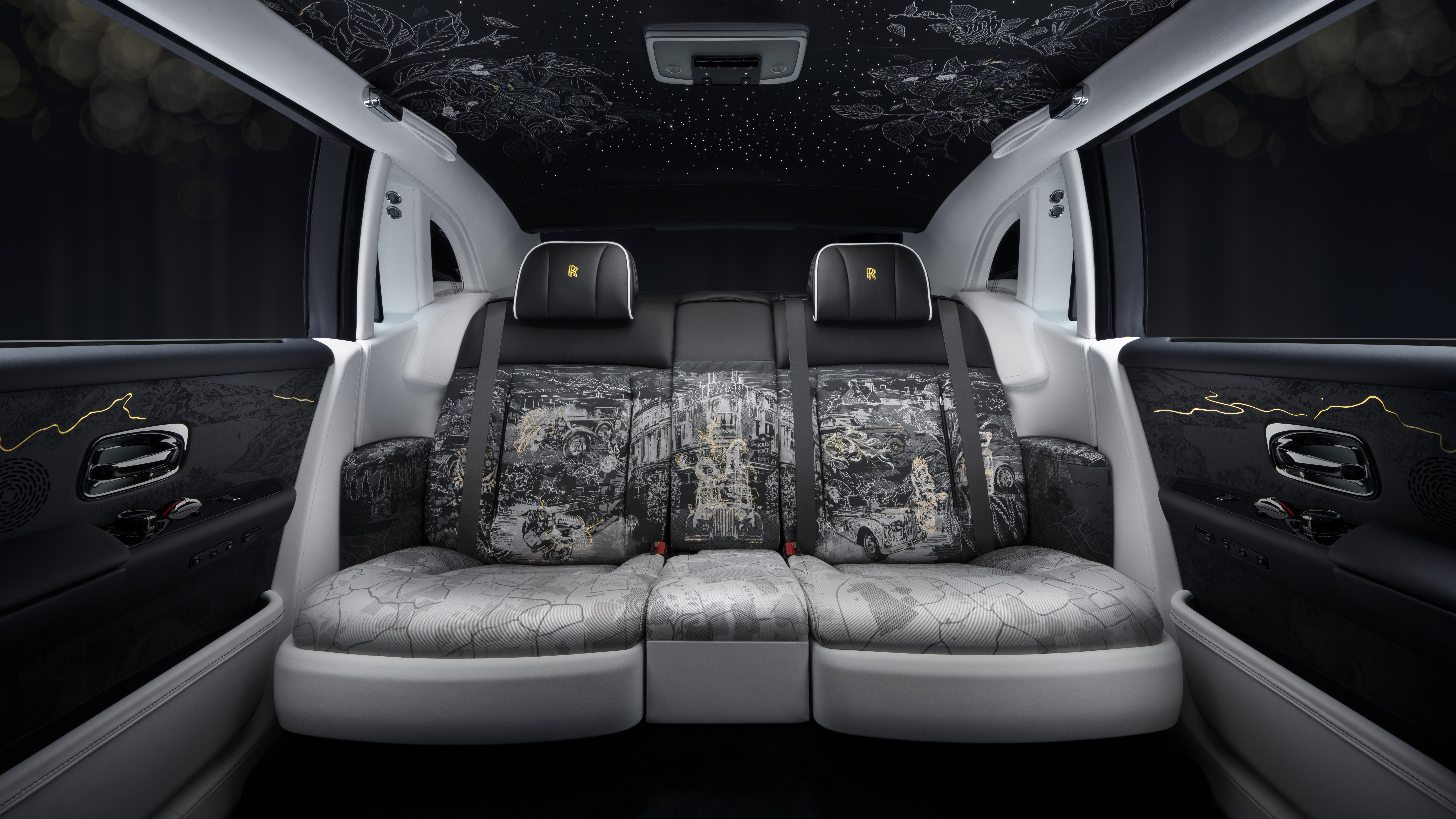 El interior del Phantom Centenary está diseñado como una narrativa visual. Los asientos traseros integran tres capas: una base impresa con referencias históricas, ilustraciones de modelos anteriores y bordados que representan a siete propietarios destacados. Este trabajo textil fue desarrollado en colaboración con una casa de moda, utilizando más de 160,000 puntadas distribuidas en 45 paneles, alineados con precisión para adaptarse a la curvatura de los asientos.