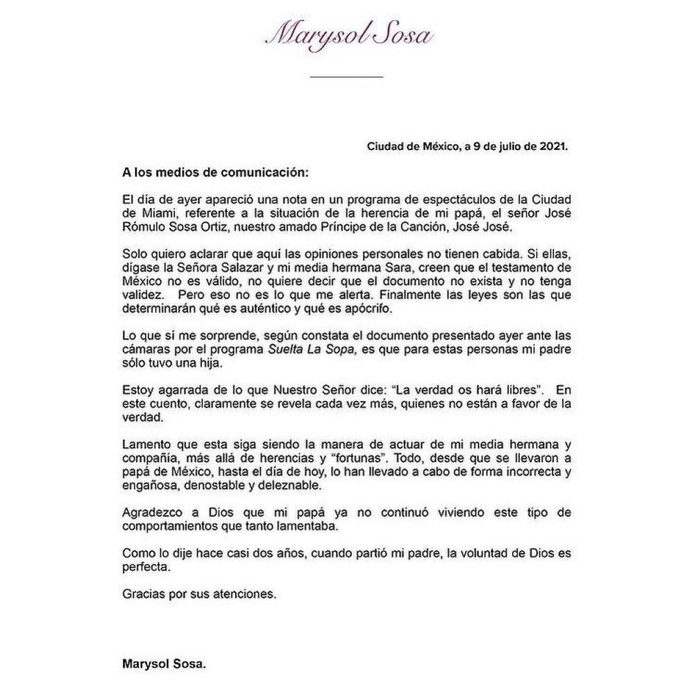 Los problemas entre los hijos del desaparecido José José parecen no terminar y un nuevo capitulo de abre entre ellos y es que la disputa por la herencia parece no dar tregua, ya que después de las declaraciones que Sarita hizo en un programa de espectáculos de la ciudad de Miami, Florida, en donde aseguró que el testamento encontrado en el que «El Príncipe» de la canción deja como heredera universal a su ex esposa Anel no tiene validez en Los Estados Unidos, su otra hija, Marisol Sosa, le contestó a través de un comunicado que México Ya les muestra, para que usted, querido lector, saque sus propias conclusiones.