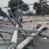 Bomberos de la Ciudad de México laboran para retirar cables derribados y un poste roto que cayó sobre la pared de una pizzería ubicada...