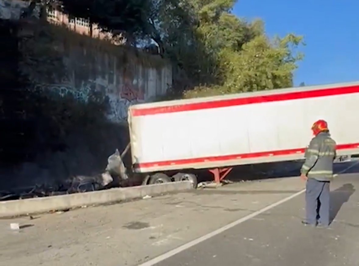 Después de ello el tráiler responsable se impactó contra un muro de contención, lo que provocó el incendio de la cabina.