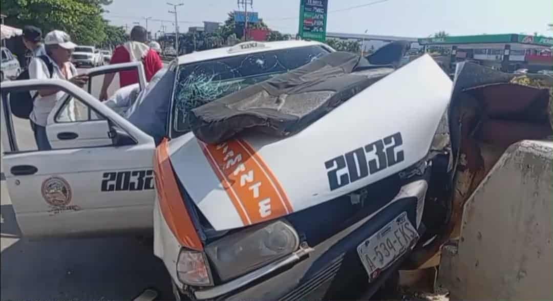 Tres personas resultan heridas cuando el taxi colectivo en el que viajaban se impactó contra el muro divisorio del paso elevado en la glorieta de Puerto Marqués, en el Puerto de Acapulco.