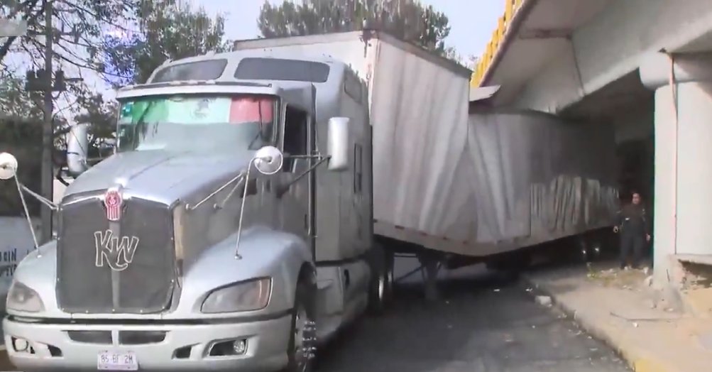 Muy temprano este martes un tráiler cargado con 26 toneladas de bebidas quedó atorado en un bajo puente ubicado en la avenida Rio Churubusco y Eje 3 Oriente en la Ciudad de México.
