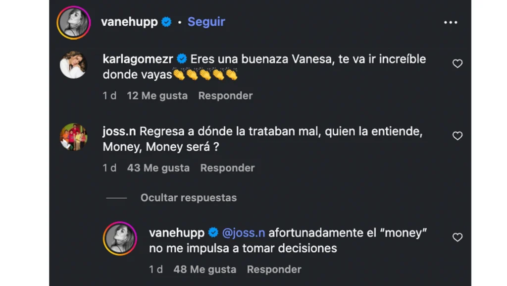 Vanessa decidió reaccionar directamente y aclarar la especulación. En una respuesta breve pero contundente, aseguró:
